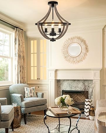 16.5" Farmhouse Light Fixtures Chandelier, 4-Light Rustic Flush Mount Ceiling Light, Modern Faux Wood Light Fixture for Dining Room Kitchen Foyer Hallway Entryway Bedroom Closet