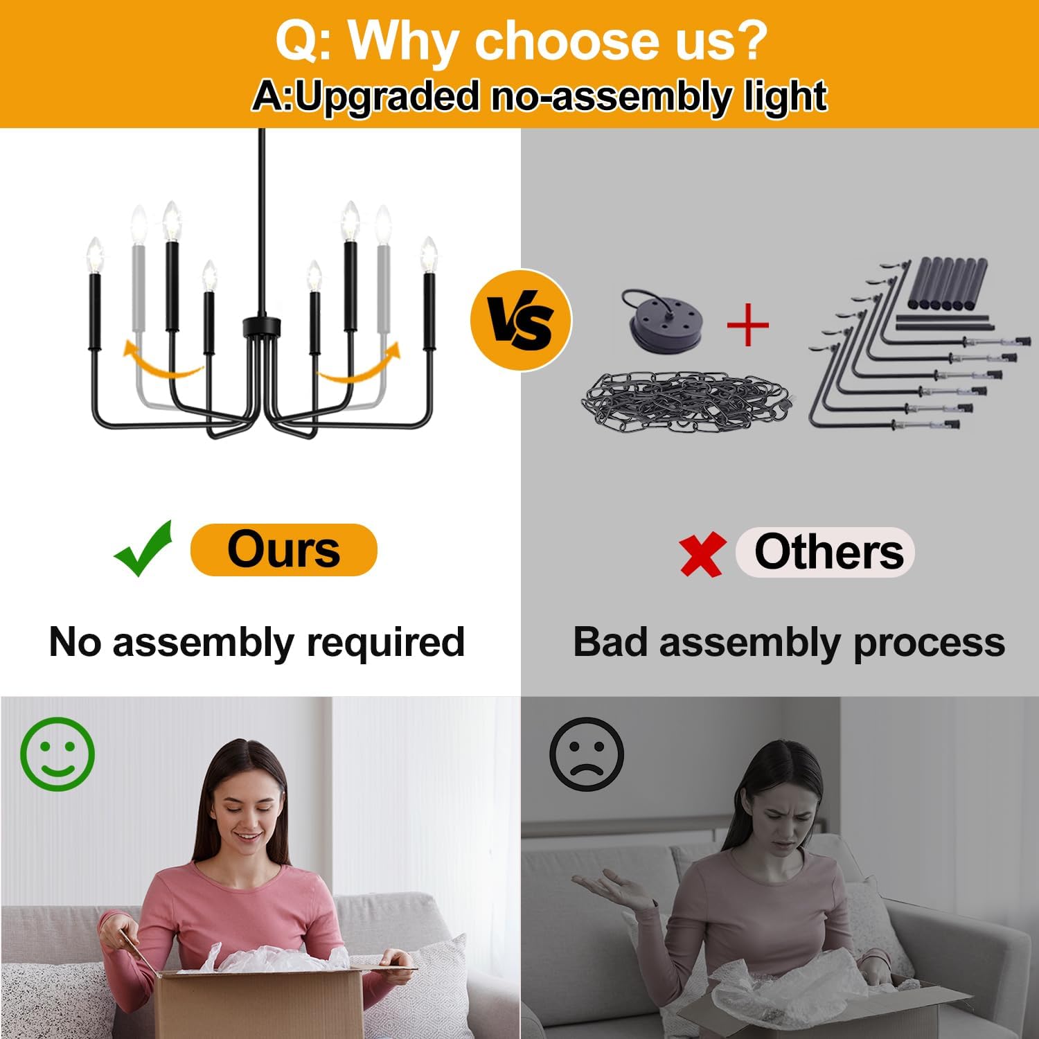 3. No Assembly Chandelier - This farmhouse chandelier comes pre-assembled with lamp arms, all you need to do is unfold 6pcs arms and you're done! Assembly is so easy!