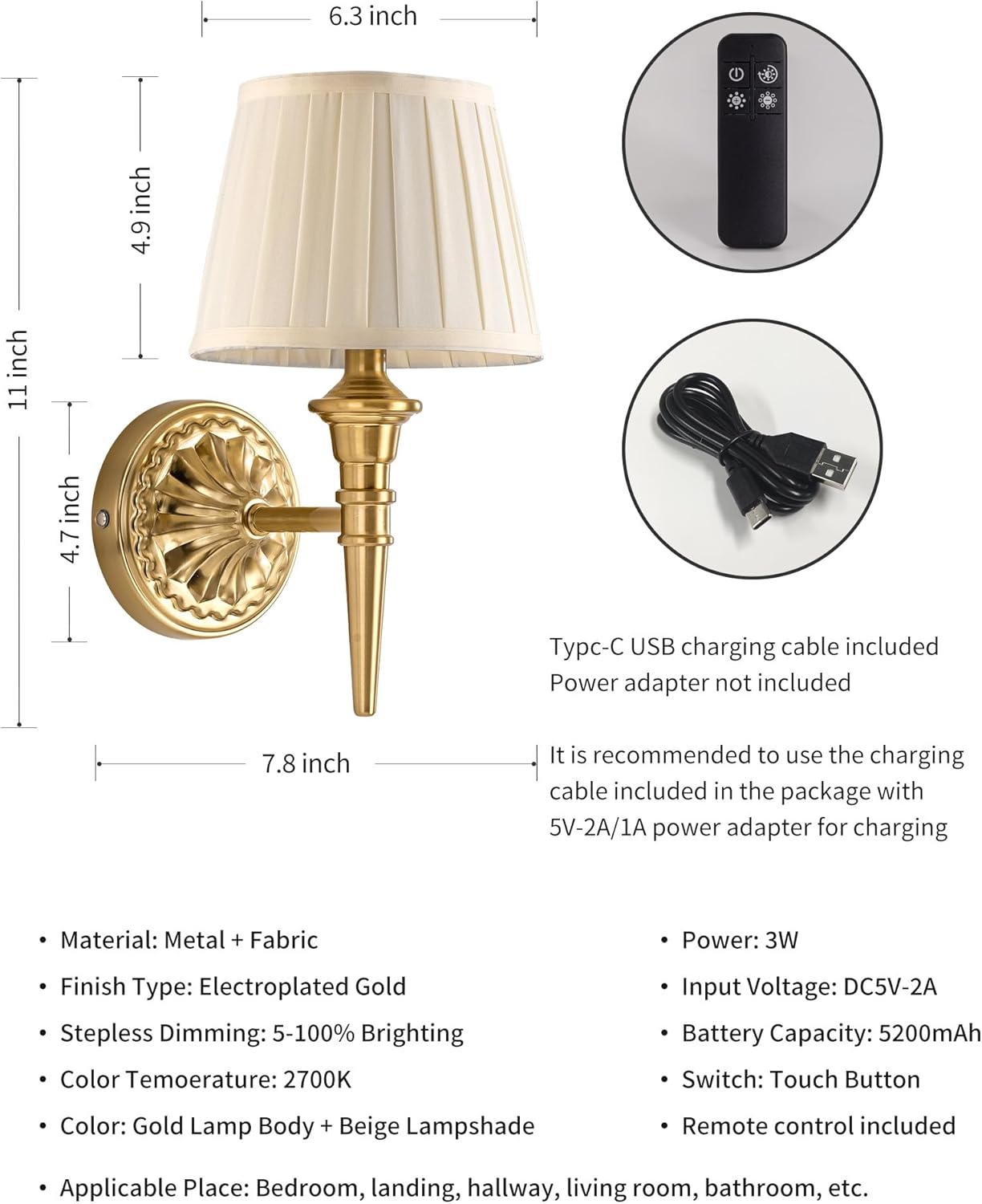 KDG Cordless Wall Sconces Set of 2, Small Wireless 5200mAh Rechargeable Battery Fabric LED Wall Lamps, Portables Lightings for Wall Painting, Living Room, Bedroom, Hallway, Gifts, Night Light (Gold)